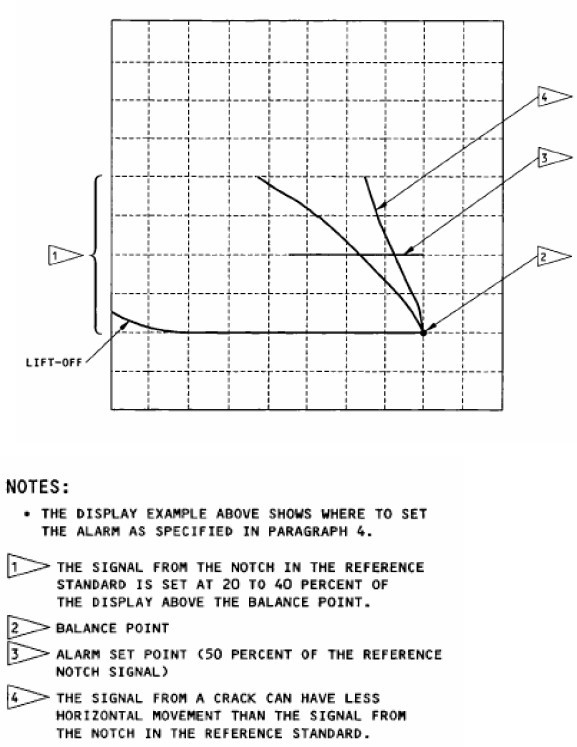 四儀器標(biāo)定Instrument Calibration A. Set the frequency between 50 and 500 kHz. NOTE: To examine scribe lines, set the frequency between 50 and 150 kHz if possible. B. Calibrate the instrument with the applicable reference standard. Paragraph 5.E. identifies the different types of structural configurations that can be examined. The reference standards to use for the different structural configurations to be examined are: (1)Large Areas, Near an Edge, On an Edge, Radius: Use reference standard 126. NOTE: To examine an area where scribe lines have been removed, and before more material is removed for an insurance blend, it is permitted to use a reference standard with a notch depth as small as 0.008 inch (0.20 mm). It is not permitted to use a notch depth that is less than 0.008 inch (0.20 mm). Before you blend scribe lines, make sure it is permitted in the repair instructions. (2). Flush Head Fasteners: Use reference standard NDT1048. (3) Protruding Head Fasteners: Use reference standard 188A. C. Set the vertical to horizontal gain between 2:1 and 4:1. D. Set the filters as follows: (1). Set the high-pass filter to off or zero Hz. (2). If the instrument has a low-pass filter: (a) Set the low-pass filter to its highest value (b).Decrease the filter value to get a stable dot. E. Put a nonconductive shim on the reference standard. The thickness of the shim must be equivalent (| 0.003 inch (0.08 mm)) to the paint thickness on the airplane. F. Put the probe on the reference standard at least 0.5 inch (12.7 mm) away from the EDM notch and the edge of the reference standard. G. Balance the instrument. H. Adjust the balance point to 20 percent of the display as shown in Detail VIII. I. Adjust the instrument for lift-off. Adjust the phase control so that the lift-off signal moves horizontally to the left when the probe is lifted off of the part surface. J. Move the probe across the notch in the reference standard. K. Adjust the gain to get a signal that is 20 to 40 percent of the display above the balance point as shown in Detail VIII. L. If the instrument has an alarm, set the alarm as shown in Detail VIII. M. Move the probe across the notch in the reference standard to find the maximum scan speed. The scan speed is too fast if the signal is less than 90 percent of the calibration notch signal. NOTE: Higher scan speeds are possible with a higher low-pass filter value. ![]()