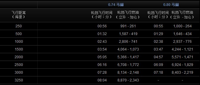輪擋時間及輪擋燃油 假設條件: A1E發(fā)動機; ISA; 無風。 NBAA IFR 備份燃油: 8名乘客 輪擋時間及輪擋燃油