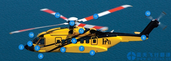 客艙長(zhǎng)度 Cabin Length 20 ft 6.1 m ![]() 西科斯基S-92直升機(jī)尺寸 安全設(shè)備 Safety ![]() 西科斯基S-92直升機(jī)安全系統(tǒng) 1, High-visibility cockpit