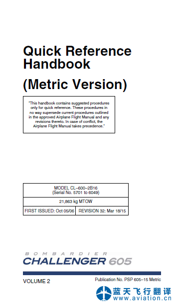 北京藍(lán)天飛行翻譯公司完成大型公務(wù)機(jī)公司的第32版/2015年3月18日版本龐巴迪挑戰(zhàn)者605全套飛行手冊(cè)翻譯任務(wù):第32版龐巴迪挑戰(zhàn)者605飛機(jī)飛行手冊(cè)、機(jī)組操作手冊(cè)、快速檢查單 Revision 32 Mar 18/15 Bombardier Challenger 605 Airplane Flight Manual, Flight Crew Operating Manual, Quick Reference Handbook Translation ![]() 龐巴迪挑戰(zhàn)者605飛機(jī)飛行手冊(cè) Bombardier Challenger 605 Airplane Flight Manual ![]() 龐巴迪挑戰(zhàn)者605機(jī)組操作手冊(cè)第一冊(cè) Bombardier Challenger 605 Flight Crew Operating Manual ![]() 龐巴迪挑戰(zhàn)者605機(jī)組操作手冊(cè) Bombardier Challenger 605 Flight Crew Operating Manual ![]() 龐巴迪挑戰(zhàn)者605快速檢查單第一冊(cè) Bombardier Challenger 605 Quick Reference Handbook ![]() 龐巴迪挑戰(zhàn)者605快速檢查單第二冊(cè) Bombardier Challenger 605 Quick Reference Handbook |
