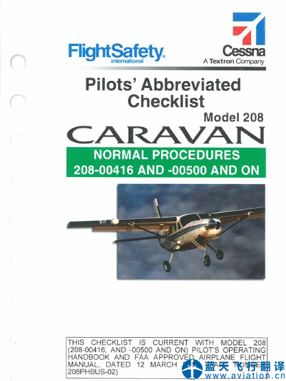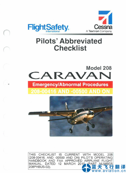 北京藍(lán)天飛行翻譯公司承接大型通航公司的塞斯納208簡易檢查單翻譯任務(wù),塞斯納208簡易檢查單包含有正常程序和應(yīng)急/非正常程序,Cessna 208 CARAVAN Pilots’ Abbreviated Checklist Translation ![]() 塞斯納208簡易檢查單正常程序 Cessna 208 CARAVAN Pilots’ Abbreviated Checklist NORMAL PROCEDURES ![]() 塞斯納208簡易檢查單應(yīng)急/非正常程序 Cessna 208 CARAVAN Pilots’ Abbreviated Checklist Emergency/Abnormal Procedures 塞斯納208簡易檢查單(Cessna 208 Pilots’ Abbreviated Checklist)的主要內(nèi)容包含有: NORMAL PROCEDURES |