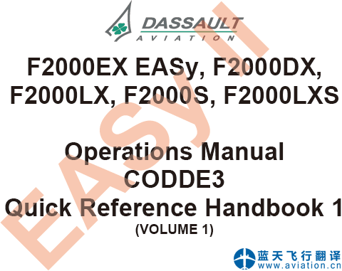 北京藍(lán)天飛行翻譯公司完成金鹿公務(wù)機(jī)公司的達(dá)索獵鷹2000公務(wù)機(jī)全套飛行手冊翻譯任務(wù) Dassault FALCON 2000 Business Jet Manual Translation 達(dá)索獵鷹2000公務(wù)機(jī)全套飛行手冊包括: FALCON 2000EX EASy、FALCON 2000DX、FALCON 2000LX、FALCON 2000LXS、FALCON 2000S 機(jī)型 Crew Operational Documentation for Dassault EASy CODDE 1 Airplane Description REVISION 14: November 30, 2013 獵鷹2000EX EASy、獵鷹2000DX、獵鷹2000LX、獵鷹2000LXS、獵鷹2000S 機(jī)型 達(dá)索EASy機(jī)組操作手冊 CODDE 1 飛機(jī)描述 修訂14: November 30, 2013 ![]() 獵鷹2000公務(wù)機(jī)機(jī)組操作手冊 FALCON 2000 Crew Operational Documentation for Dassault EASy FALCON 2000EX EASy、FALCON 2000DX、FALCON 2000LX、FALCON 2000S、FALCON 2000LXS 機(jī)型 Crew Operational Documentation for Dassault EASy CODDE 2 REVISION 16 : November 30, 2013 ![]() 獵鷹2000公務(wù)機(jī)機(jī)組操作手冊 FALCON 2000 Crew Operational Documentation for Dassault EASy F2000EX EASy、F2000DX、F2000LX、F2000S、F2000LXS Operations Manual CODDE3 Quick Reference Handbook 1和2 Revision 18 30-NOV-13 F2000EX EASy、F2000DX、F2000LX、F2000S、F2000LXS 操作手冊l CODDE3 快速檢查單 1和2 修訂 18 30-NOV-13