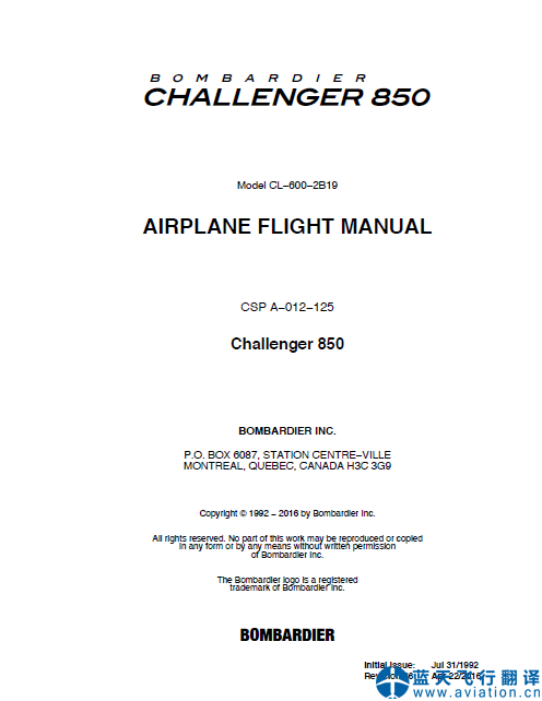 北京藍天飛行翻譯公司完成大型公務(wù)機公司龐巴迪挑戰(zhàn)者850飛機飛行手冊翻譯任務(wù) BOMBARDIER Challenger 850 AIRPLANE FLIGHT MANUAL Translation ![]() 龐巴迪挑戰(zhàn)者850飛機飛行手冊 BOMBARDIER Challenger 850 AIRPLANE FLIGHT MANUAL |