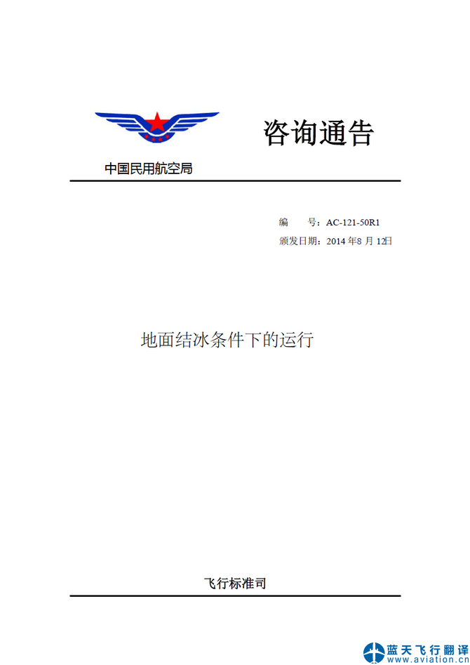 北京藍(lán)天飛行翻譯公司承接中國(guó)民用航空局飛行標(biāo)準(zhǔn)司地面結(jié)冰條件下的運(yùn)行咨詢通告翻譯 CAAC Advisory Circular Translation: Ground Operation In Icing Conditions ![]() 地面結(jié)冰條件下的運(yùn)行咨詢通告 地面結(jié)冰條件下的運(yùn)行咨詢通告的內(nèi)容包含有: 中國(guó)民用航空局咨詢通告