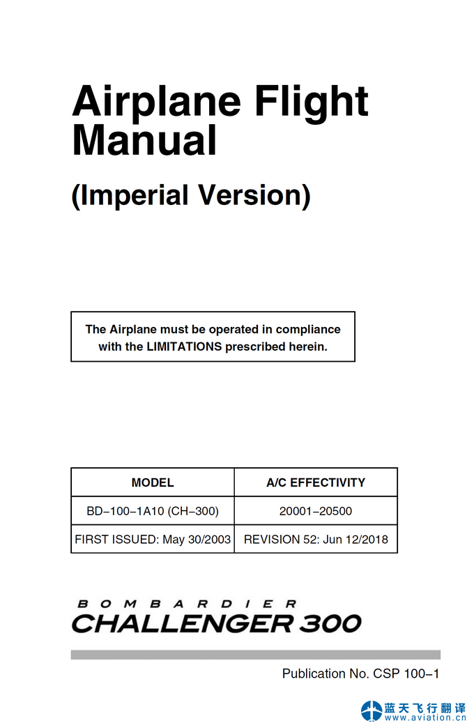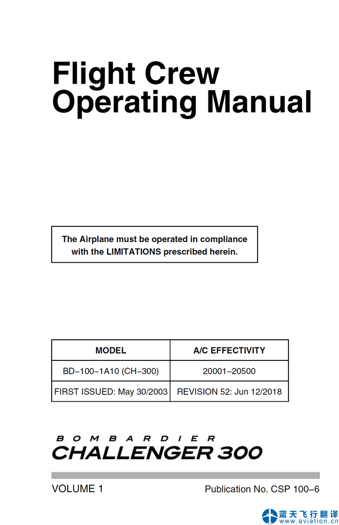 北京藍(lán)天飛行翻譯公司承接公務(wù)機(jī)公司2018年6月12日第52版龐巴迪挑戰(zhàn)者300公務(wù)機(jī)全套飛行手冊(cè)翻譯任務(wù) REVISION 52: Jun 12/2018 Bombardier Challenger 300 Flight Crew Operating Manual, Airplane Flight Manual and Quick Reference Handbook Translation ![]() 龐巴迪挑戰(zhàn)者300 Bombardier Challenger 300 本次翻譯的龐巴迪挑戰(zhàn)者300公務(wù)機(jī)飛行手冊(cè)包含有: 挑戰(zhàn)者300機(jī)組操作手冊(cè) Challenger 300 Flight Crew Operating Manual 版次為2018年6月12日第52版 挑戰(zhàn)者300飛機(jī)飛行手冊(cè) Challenger 300 Airplane Flight Manual 版次為2018年6月12日第52版 挑戰(zhàn)者300快速檢查單 Challenger 300 Quick Reference Handbook 版次為2018年6月12日第52版 ![]() 挑戰(zhàn)者300 Challenger 300