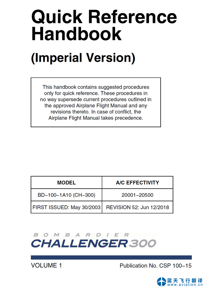 ![]() 挑戰(zhàn)者300機(jī)組操作手冊(cè) Challenger 300 Flight Crew Operating Manual ![]() 挑戰(zhàn)者300飛機(jī)飛行手冊(cè) Challenger 300 Airplane Flight Manual ![]() 挑戰(zhàn)者300快速檢查單 Challenger 300 Quick Reference Handbook