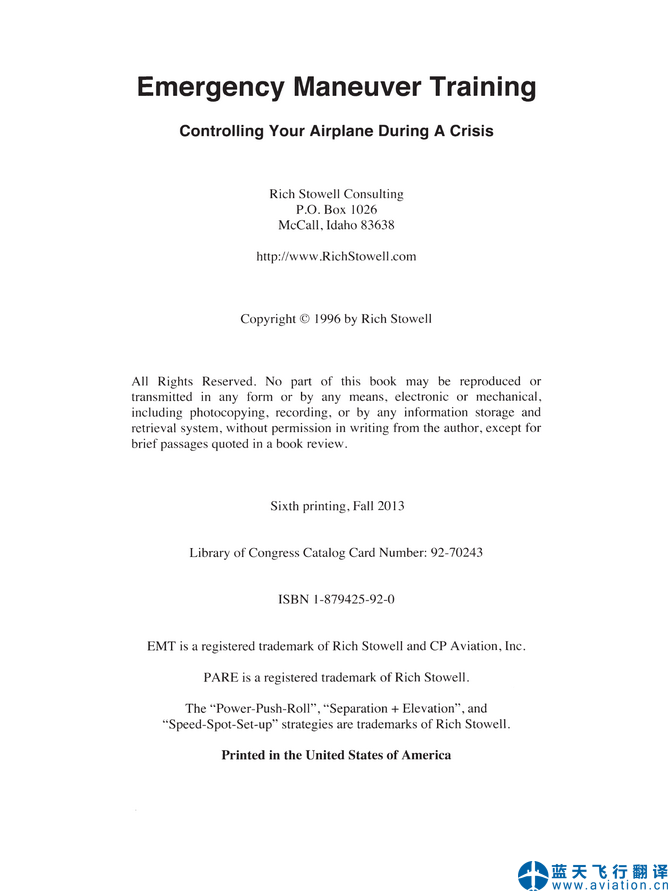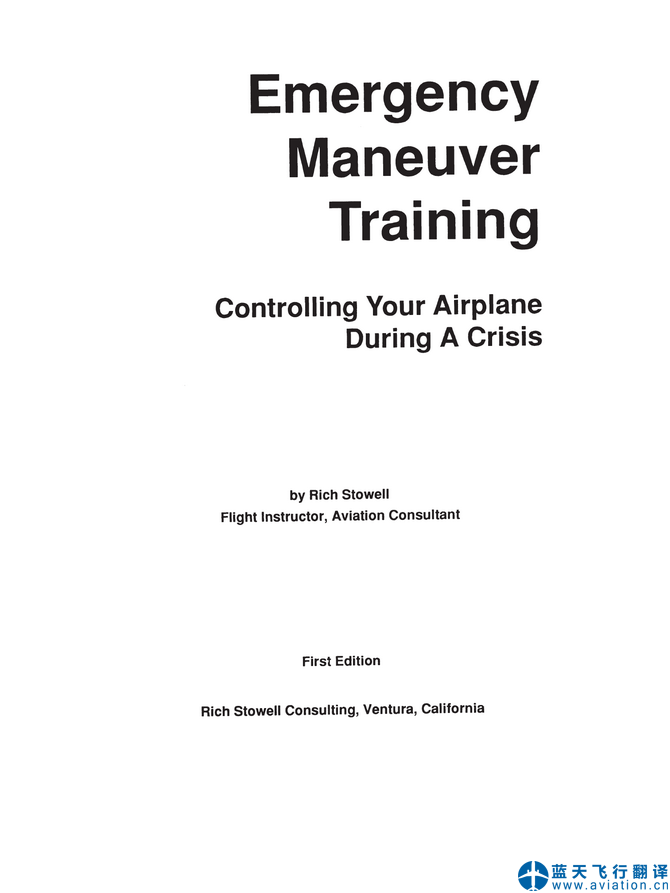 藍(lán)天飛行翻譯公司承接大型航校緊急機(jī)動(dòng)飛行訓(xùn)練手冊翻譯任務(wù) Emergency Maneuver Training Manual Translation ![]() ![]() 緊急機(jī)動(dòng)飛行訓(xùn)練手冊 Emergency Maneuver Training Manual 緊急機(jī)動(dòng)飛行訓(xùn)練手冊(Emergency Maneuver Training Manual)的主要內(nèi)容包含有: Emergency Maneuver Training Basic Aerodynamics Steady Flight Important Ratios Roll, Yaw, and Pitch Roll Yaw Pitch Secondary Roll Effects Secondary Yaw Effects Secondary Pitch Effects Pitch and Power Energy Management The Power Curve Curved Flight Forces in Turns G-Loads The V-g Diagram Helpful Hints Shallow Turns Medium Turns Steep Turns Climbing & Descending Turns Skidding Turns Slipping Turns Turn/Roll Combinations Spirals Final Thoughts Stalls Flying the V-g Diagram Aerodynamic Cues Mechanical Cues Physiological Cues Approach-To-Landing Stall Departure Stall Under-The-Bottom Stall Over-The-Top Stall Prolonged Stall Deep Stall Tail Stall Stall Speed vs. C.G. Flaps Final Thoughts Spins Spin Dynamics Incipient Developed Recovery Inertia Effects Wing Design Fuselage Design Tail Design Pilot-Controlled Variables Power Ailerons Flaps Rudder Elevator Procedure vs. Technique Accelerated Spin Transition Spin Cross-Over Spin Pilot-Induced Flat Spin Overbanked Roll Dynamics V-p & V-g Diagrams Power Push Roll Managing The Airspeed In The Pattern Invisible Tornadoes Aircraft Configuration Effects Atmospheric Effects Separation Elevation Be Prepared Control Failures Ailerons Rudder Elevator Flaps Flutter Glides Weight Wind Turning Flight Airplane Configuration Judging Glide Distance The Glide Envelope Powerplant Failures Power Loss Speed Spot Set-up Loss Of Power Control Off-Airport Landings Engine Restart Evaluating Your Options Flying the Approach The Touchdown The Pilot In Command Situational Awareness Judgment Hazardous Attitudes Stressors See And Be Seen It’s Up To You For More Information EMT® Program Syllabus Bibliography |