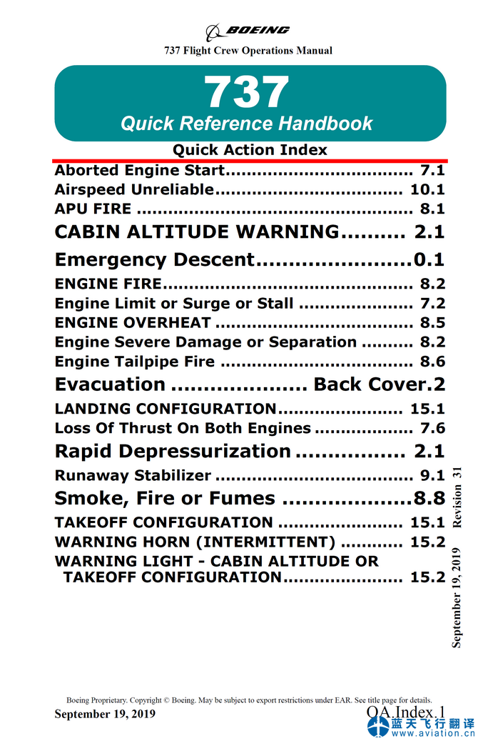 北京藍(lán)天飛行翻譯公司完成大型航空公司2019年9月19日版本波音737-800快速檢查單翻譯任務(wù) September 19, 2019 Revision 31 737-800 Quick Reference Handbook (QRH) Translation