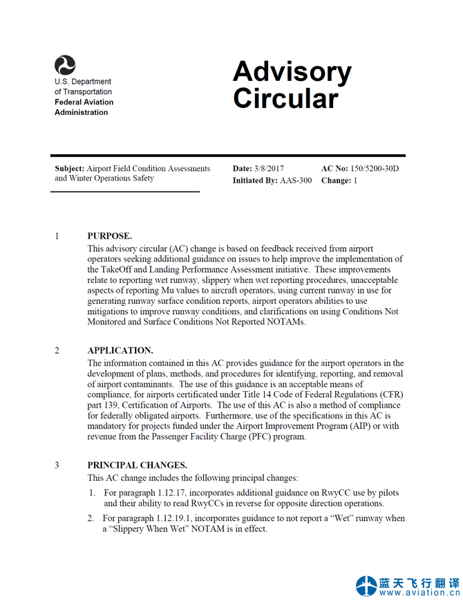 北京藍(lán)天飛行翻譯公司承接大型航校的FAA咨詢通告機(jī)場(chǎng)條件評(píng)估和冬季運(yùn)行安全翻譯任務(wù) FAA Advisory Circular Airport Field Condition Assessments and Winter Operations Safety Translation