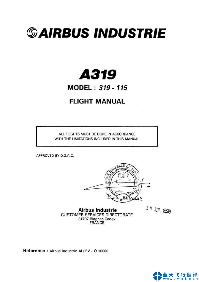 北京藍(lán)天飛行翻譯公司完成大型公務(wù)機(jī)公司的2020年11月10日版本空客公務(wù)機(jī)ACJ319飛機(jī)飛行手冊(cè)(AIRPLANE FLIGHT MANUAL)翻譯任務(wù) 10 NOV 20 ACJ319 AIRPLANE FLIGHT MANUAL Translation