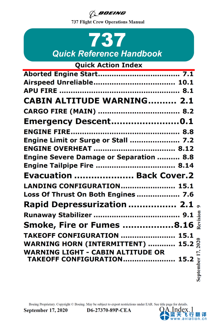 北京藍天飛行翻譯有限公司完成大型航空公司的2020年9月17日版本波音737-700/-800飛行機組使用手冊(Flight CrewOperations Manual FCOM)和快速檢查單(Quick Reference Handbook QRH)翻譯任務 737-700/-800 Flight CrewOperations Manual and Quick Reference Handbook Translation